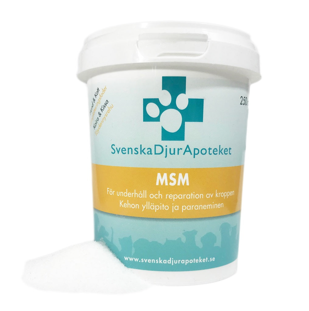 Svenska DjurApotekets MSM är en svavelförening som kroppen använder för att reparera och skapa nya celler. Genom att komplettera kosten med MSM, så fyller du på hundens svavelförråd och får en piggare och ett mer välmående djur. MSM är viktigt för djurens uppbyggnad av brosk, leder, senor, bindväv, skelett, muskler och päls.